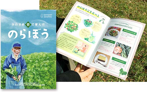 数年にわたる菅のらぼう保存会 会長 髙橋孝次さんの取材を通して、小学校の出前授業などでお話される「のらぼう菜」に関する内容を冊子にまとめることができました。この1冊でかわさきの「のらぼう菜」のことを楽しく学ぶことができます。 地域飲食店の協力から「のらぼう菜」を活かした美味しいレシピも掲載していますので、お料理にも重宝します。デザインとイラストは地域で活躍する女性デザイナー&イラストレーターにお願いしました。 かわいいイラストをふんだんに使った子どもにも親しみやすい冊子です。