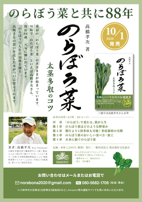のらぼうプロジェクトでは2015年よりのらぼう菜にこだわり続けて活動してきました。その活動において川崎市多摩区の菅のらぼう保存会会長・髙橋さんにはワークショップでの講師や、のらぼう菜に関する情報提供など、継続してご協力およびご指導をいただき今日まで大変お世話になってきました。また、プロジェクトのロゴマークは髙橋さんに描いていただいた手描きののらぼう菜イラストを原書としています。 その髙橋さんの本がついに発売されます!メンバーの清水まゆみさんに「のらぼう菜と歩んできたことを本にまとめて残したい」と言われたことがきっかけで、ついにその思いが実現します。プロジェクトとしても5年間の活動の集大成との思いで胸が熱くなります。 タイトルは「のらぼう菜 太茎多収のコツ」まさにのらぼう菜づくしの一冊です。プロジェクトとしても執筆のサポートや装丁デザインにご協力いたしました。また、プロジェクトの活動についても本の中でご紹介いただいています。 表紙題字の筆文字「のらぼう菜」は髙橋さんの自筆です。この文字の持つ雰囲気だけでものらぼう菜と共に歩んだ88年の重みを感じます。 内容は、のらぼう菜がアブラナ科の中でどのような特性を持っているか、髙橋さんの編み出した栽培技術、川崎の飲食店の皆さんが編み出してくれたのらぼう菜の料理やベーグル、キムチの紹介。そして、髙橋さんの生きがいである市内20の小・中学校での出前授業まで。88歳の髙橋さんの88ページの本です。 一般社団法人 農山漁村文化協会から2020年10月1日に発売され、本体1,200円(税別)となります。添付チラシにあるメールまたはお電話(担当:清水)、またはinfo@kawasaki-norabo.netまでお問い合せください。髙橋さんの88年間の集大成をどうぞよろしくお願いいたします!